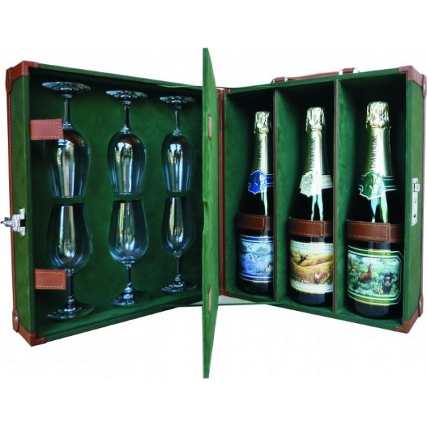 Coffret chasse en cuir et toile, de couleur vert anglais, pour 3 bouteilles de champagne (Non fournis).