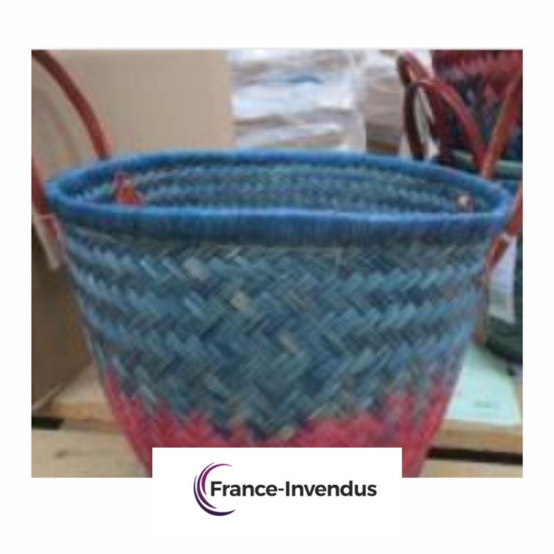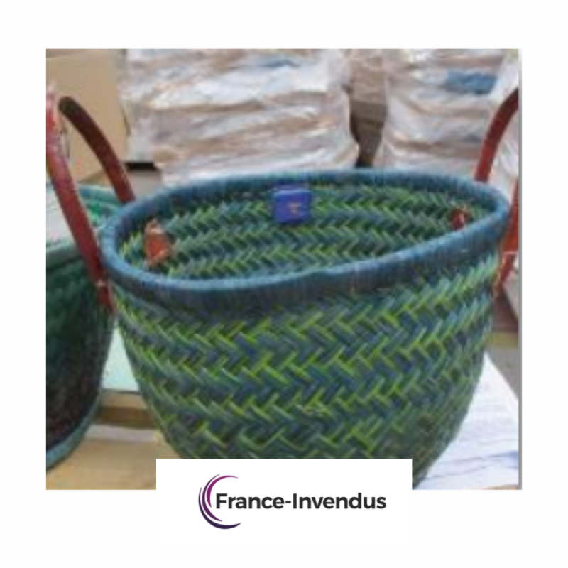 Differents cabas de qualite, en osier, multicolore, fabriques a Madagascar
